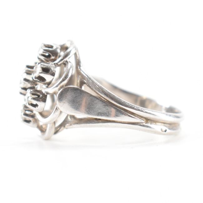 A vintage French 18ct white gold and diamond ring. The ring being set with a central round brilliant cut diamond to the centre and eight round cut diamonds surrounding it with a flower design head. French eagle mark to shank. Weight 5.0g. Size N. Estimated 0.36ct.