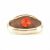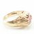 A hallmarked 9ct yellow gold & red stone solitaire ring. The ring having a round cut red stone to buttercup claw setting with etched scrolling detail extending to the shoulders on a tapered shank. Hallmarked for London 1989, sponsors marks for Bh. Stone measures approx 7.5x7.5x4.9mm. Total weight approx 8.3g. Approx size T.