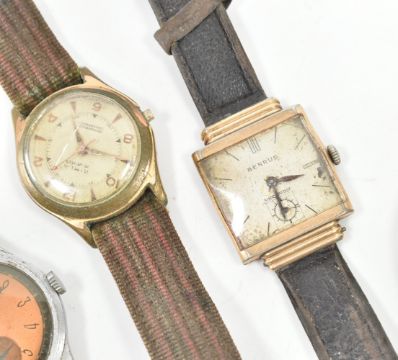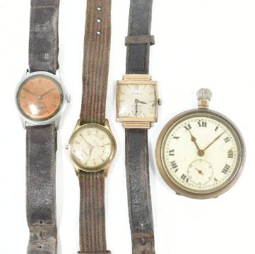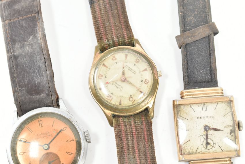 An assorted collection of wrist watches & pocket watch. The lot to include; a gold tone square dial Benrus shockproof wristwatch with leatherette strap, a round face mixed indices Rimla stainless steel back 15 jewels waterproof shockproof antimagnetic Swiss made wristwatch, a Rodana stainless steel antimagnetic Swiss made fond acier inoxysable leatherette strap watch & an Ancre De Precision Swiss made pocket watch. Total weight approx 170.6g. Pocket watch measures approx 6.5cm.