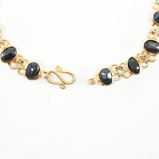 A vintage yellow gold & sapphire bracelet chain. The chain comprised of oval cut bezel set sapphire in fancy links & united by a hook & eye clasp. Unmarked, tests indicate 14ct gold. Total weight approx 5.3g. Measures approx 18cm.
