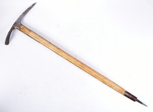 A WWII Second World War Third Reich Nazi German Mountain Troop (Gebirgsjager) memento ice pick. The shaft with and applied white metal plaque ' In Memory of my Service Geb. Jg. Rgt 138 1940-1945. Measures approx 85cm.Note; from a large private collection of militaria. Due to the nature of the items, buyers are reminded for the need to satisfy themselves as to condition / originality / authenticity prior to bidding. All lots remains sold strictly 'as is' irrespective of any description.