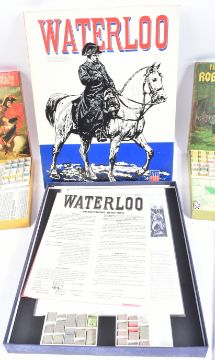 Three vintage Avalon Hill board games; 1962 'Waterloo' Napoleonic Campaign game containing playing pieces, playing sheets, instruction manual and two boards, 1983 'Battle for Italy' Napoleonic Campaign game containing playing pieces, playing sheets, instruction manual and one board, and 1982 'The Legend of Robin Hood' 12 Century English Folklore game containing playing pieces, two dice, two instruction manuals and one board. Games unchecked for completeness.