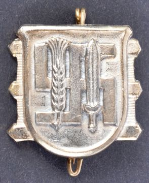 A WWII Second World War Third Reich Nazi German Farmers Union (Reichsnahr) Supporters badge. Shield shape with a central Swastika overlaid with a sword and sheath of corn.Note; from a large private collection of militaria. Due to the nature of the items, buyers are reminded for the need to satisfy themselves as to condition / originality / authenticity prior to bidding. All lots remains sold strictly 'as is' irrespective of any description.