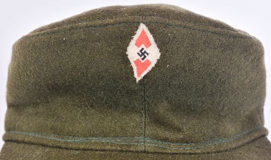 A WWII Second World War Third Reich Nazi German Hitler Youth cap and a Reich Protection League armband. The khaki wool cap with a stitched Hitler Youth lozenge and the armband with printed RLB monogram and an applied Luftschutz metal badge.Note; from a large private collection of militaria. Due to the nature of the items, buyers are reminded for the need to satisfy themselves as to condition / originality / authenticity prior to bidding. All lots remains sold strictly 'as is' irrespective of any description.