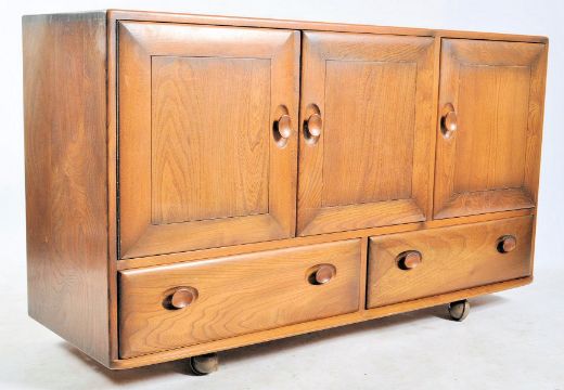 Lucian Ercolani - Ercol - Model 366 - A retro 1960s beech and elm sideboard credenza in a blonde / golden dawn finish. Comprises a figuration of drawers and cupboards raised on castors .Measures approx. 77cm x 130cm x 44cm.