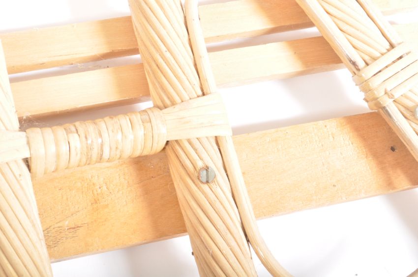 A pair of retro 20th century bamboo wicker rattan single bed headboards. Each headboard in a fan shaped form with bent bamboo creating petal like decoration. Each measuring approx. 103cm x 99cm.