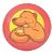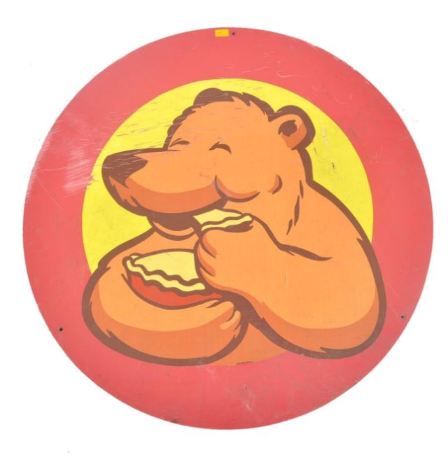A large 20th century fairground / funfair food court fiberglass circular panel finished in red with a central image of a bear eating a pie. Measures approx. 107cm diameter.