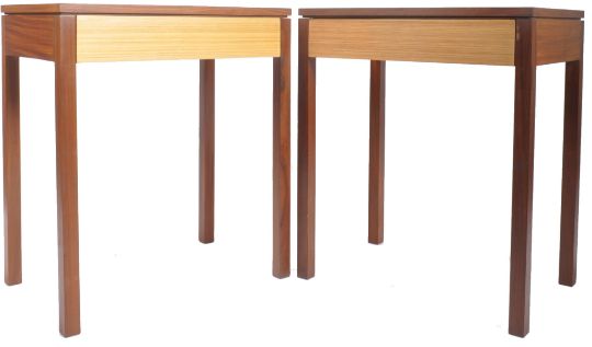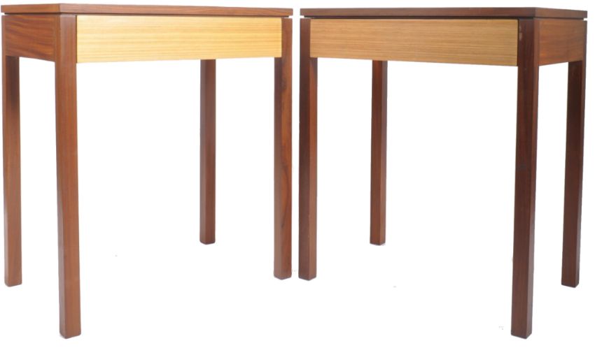 British Modern Design - A pair of retro vintage mid 20th century British furniture teak side occasional tables having straight tops over a single drawer, raised on straight supports. Each measuring approximately 71cm x 61cm x 41cm.