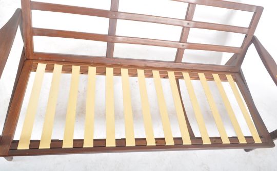 R. W. Toothill for Toothill Furniture - A retro 1960s teak wood framed three seater sofa setter having a slatted backrest with rubber webbing supports for the seat cushion. The sofa having propeller armrests with all being raised on tapering legs. Known to have been retailed by Heals. Lacking cushions. Measures approx. 71cm x 165cm x 75cm.