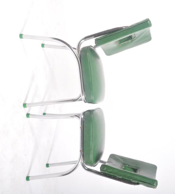 A pair of vintage 20th century American diner / breakfast bar chairs with each having green leatherette upholstered seat and backrests. Each dining chair raised on chromed tubular supports. Each measures approx. 87cm x 40cm x 45cm.