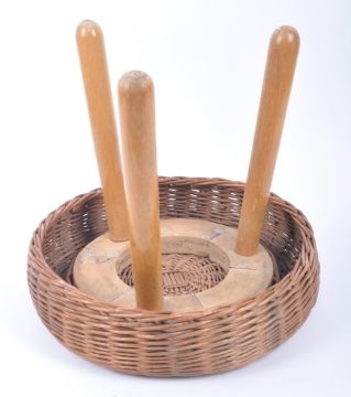 Tony Paul - A retro 20th century 1960s milking stool. The foot stool having a circular basket weave wicker seat raised on turned splayed beech supports. Wear commensurate with age, mostly to bottom of the legs, overall good. Measures approx. 33cm x 35cm diameter.