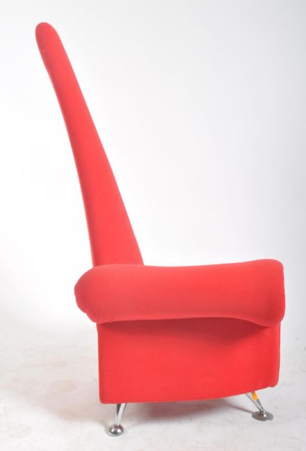 Potenza chair - A contemporary retro style high back armchair / novelty reading chair having a tall slender backrest with one right sides scrolled armrest and barrel seat rest. All raised on splayed tapering polished steel supports upon disc feet. Measures approx. 114cm x 66cm x 58cm.