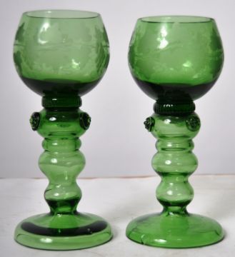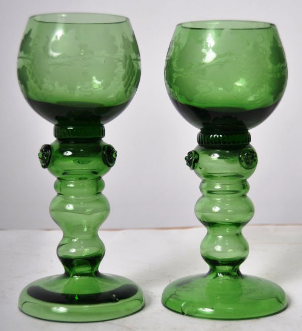A set of six 19th Century green glass drinking wine goblets glasses having etched leaf and vine decoration with triple baluster stem set with prunts over circular foot bases. Measures approx; 18cm tall.