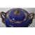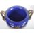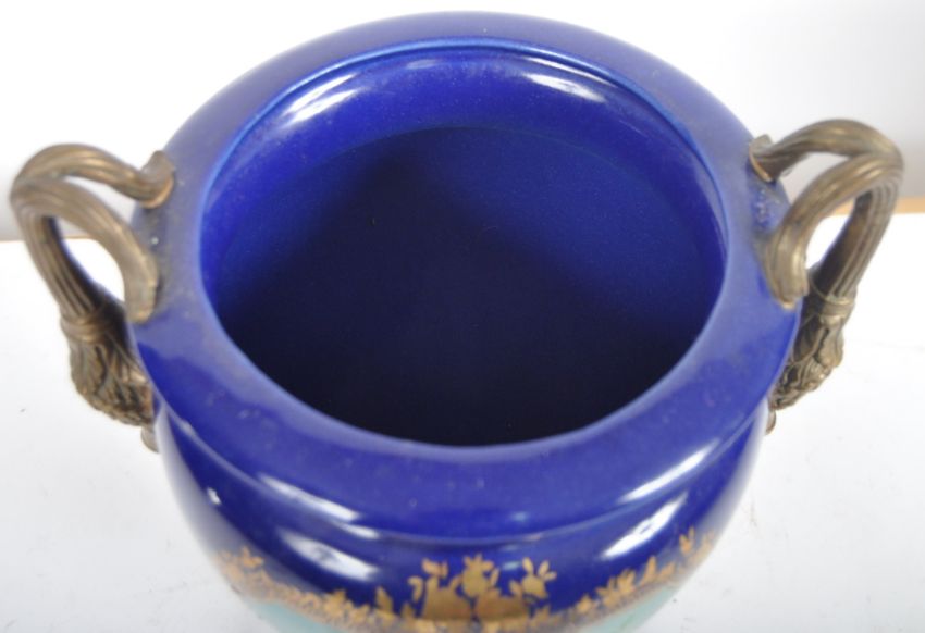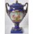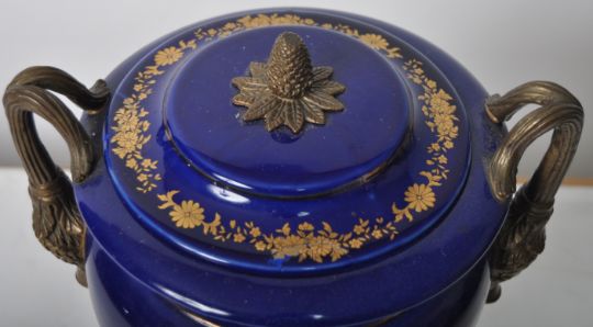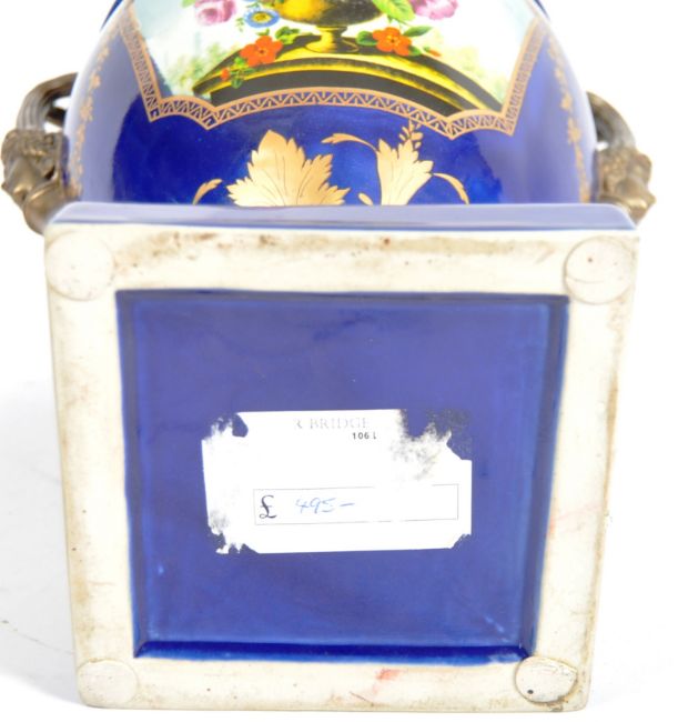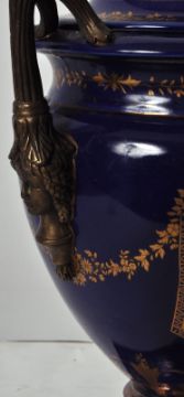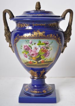 An early 20th Century continental porcelain lidded urn in the Dresden style, having a deep cobalt ground with gilt decoration and large panels depicting floral sprays. Acorn finial to lid flanked by face mask handles over a pedestal base. Measures approx; 35cm tall.