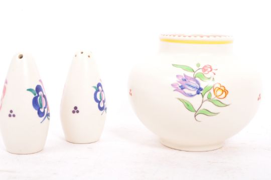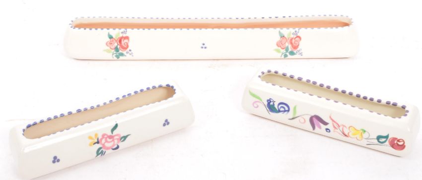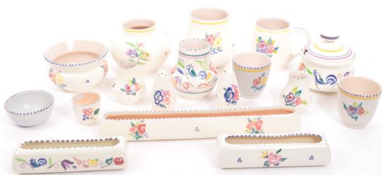Poole Pottery - Traditional Ware - An assortment of vintage 20th century circa 1950s & later Poole pottery ceramic items from the traditional ware range. The lot to include a vases of various shapes & sizes, three posy trough dishes, bowls, small pots & cups, sugar & salt sifters & lidded sugar bowl. All signed & marked to base. Largest measuring 30L x 5H cm.