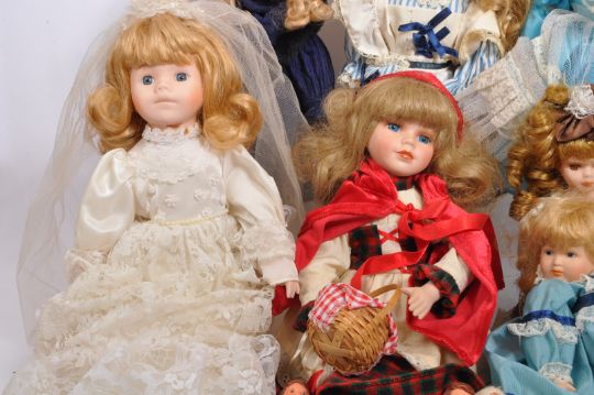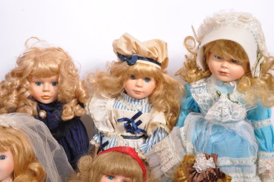 A collection of assorted vintage porcelain headed dolls. Firmly stuffed cloth body with porcelain head and limbs, finely painted features and dressed in period clothing. Largest measures approx 50cm.