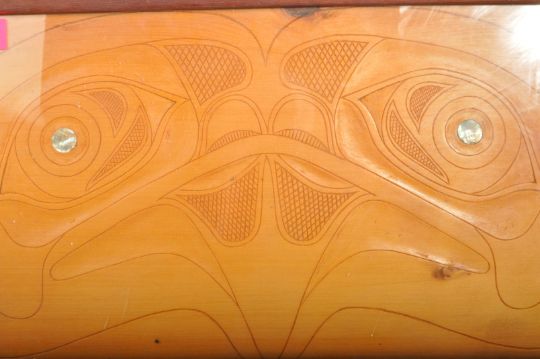 A 20th century Polynesian carved wooden tray. The tray having inlaid mother of pearl and paddles carved in relief. Measures 77cm length.