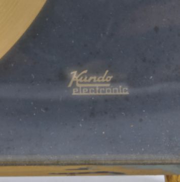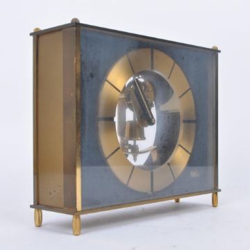 Kundo - A retro vintage mid 20th century gilt metal and glass desk clock / mantel clock. Central dial with swinging partial exposed pendulum. The clock of square form raised on small bun feet. Measures approx. 19cm x 23cm x 17cm.