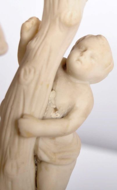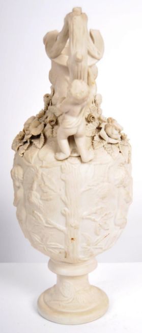 A 19th Century Parian ware ewer jug pitcher of large size having relief moulded decoration depicting frolicking putti with floral sprays and naturalistic handle raised on pedestal base. Measures approx; 37cm tall.