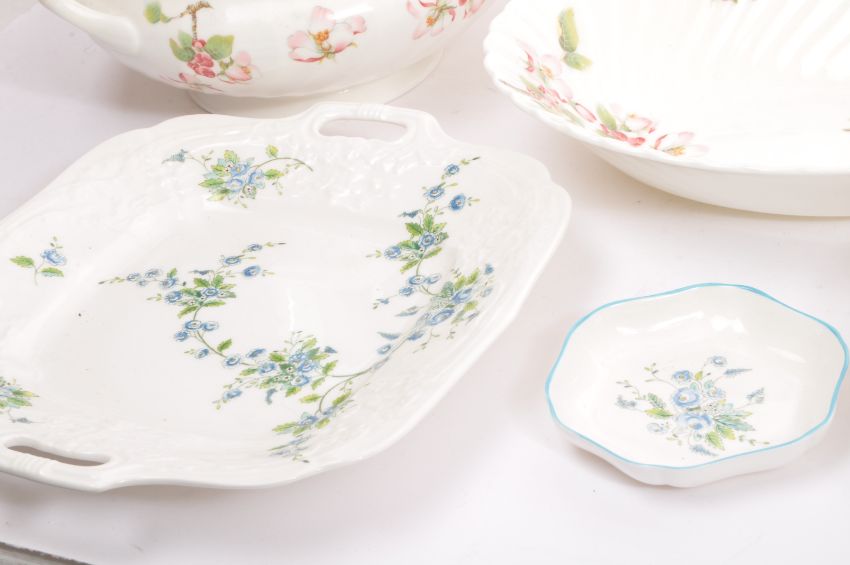 Wedgwood - Apple Blossom - A vintage 20th century Wedgwood bone china dinner service comprising of tureens, dinner plates, dessert plates, serving plates. Each piece with white ground, gold rims and floral blossom decoration. Alongside several Aynsley pieces.