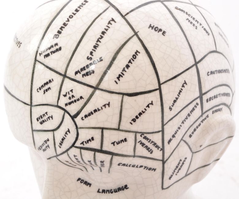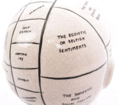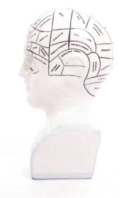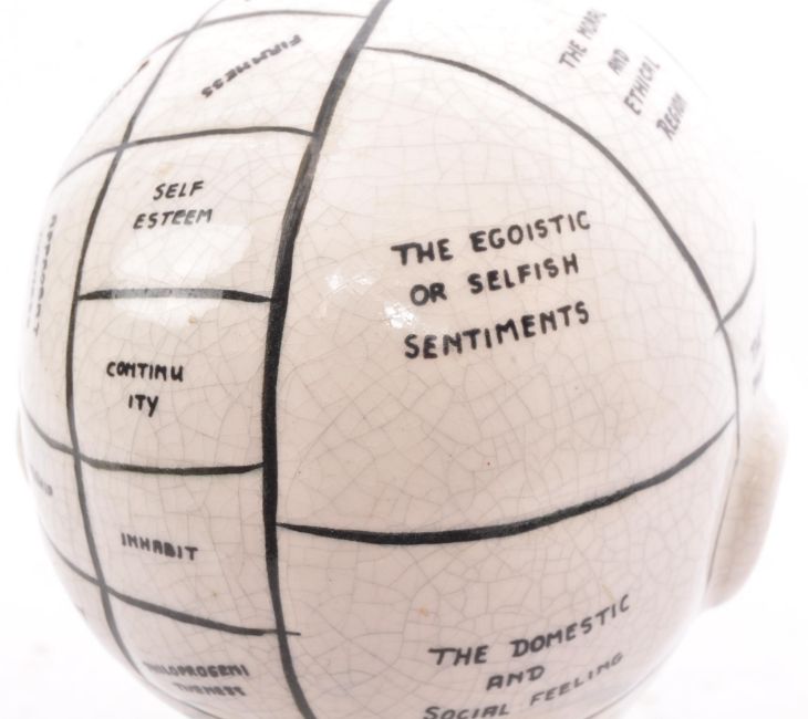 A Victorian manner painted phrenology head in the manner of Fowler. Typical form with painted details and notations. Measures approx; 21cm tall.
