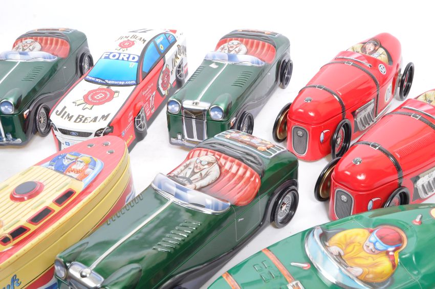 A large collection of vintage 20th century & later silver crane car shaped advertisement confectionery tin boxes. The lot to include various car & drivers' types. To include over ten examples.