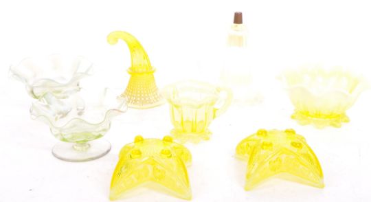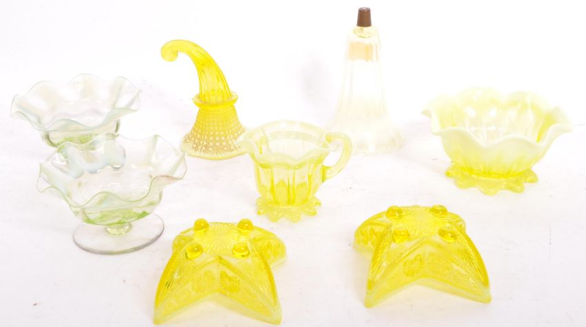 A collection of 19th century Victorian uranium Vaseline glass to include a pair of Davidsons Primrose Pearline 'War of the Roses' a cornucopia with lattice decoration, footed vases and an epergne.