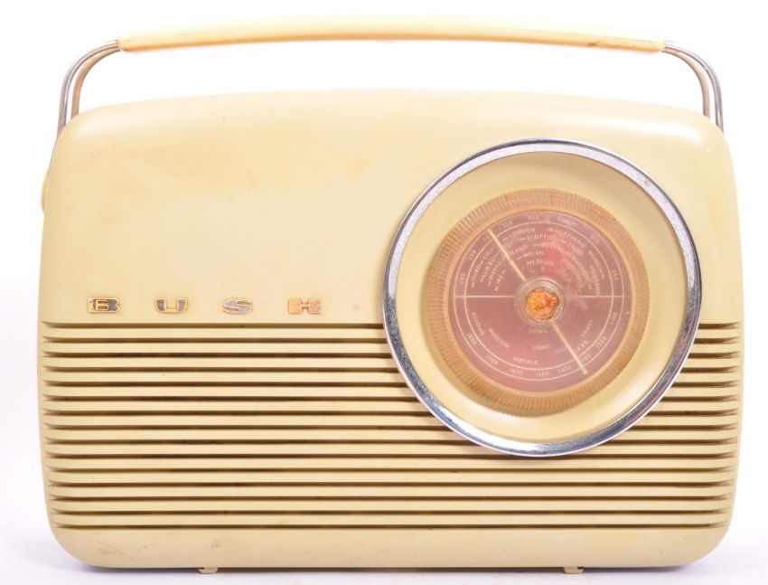 A retro vintage 20th century Bush TR82C transistor radio. Battery operated portable radio with large tuner dial, Medium & Long wave push button selector, volume, off-on tone dial and carry handle. Serial Number 346/166/87. Dimensions 27cm (height), 34cm (length), 9cm (depth). And a smaller brown leatherette Crown battery operated portable 'Solid State 11' - Transistor radio. Dimensions 19cm (height), 23cm (length), 9cm (depth).