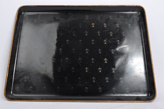 A collection of three early 20th Century serving trays / plates. With worn gilt decoration to one with 4373 D2885 painted to side with a smaller tray with rattan woven decoration and a large plastic ebonised and gilt decoration with repeating scrolled classical motifs. Largest measures approx. 36cm x 26cm