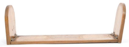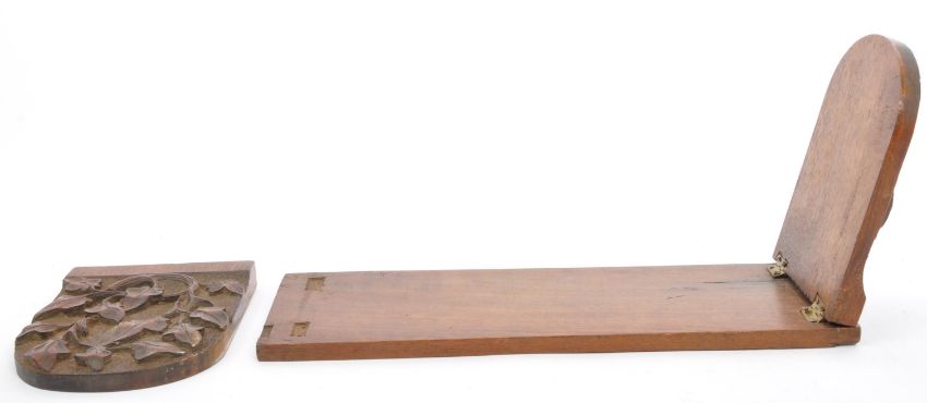 A 19th century Victorian book trough folding slide with carved ends in oak wood together with a marquetry inlaid book trough with folding ends. Together with a Victorian walnut and brass set of scales