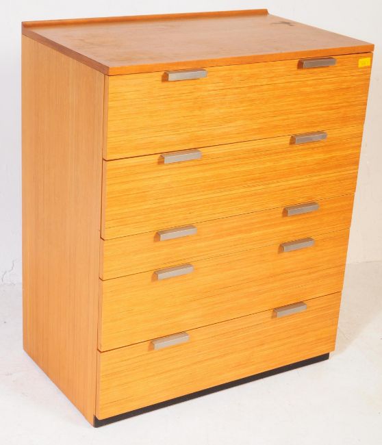 Stag Furniture - John & Silvia Reed - A retro mid 20th century circa. 1960's Stag teak chest of drawers. The chest of drawers having a bank of five drawers of varying form, each with chrome bar handles, raised on a plinth base. Measures approx. 94cm x 76cm x 48cm.