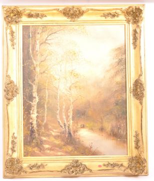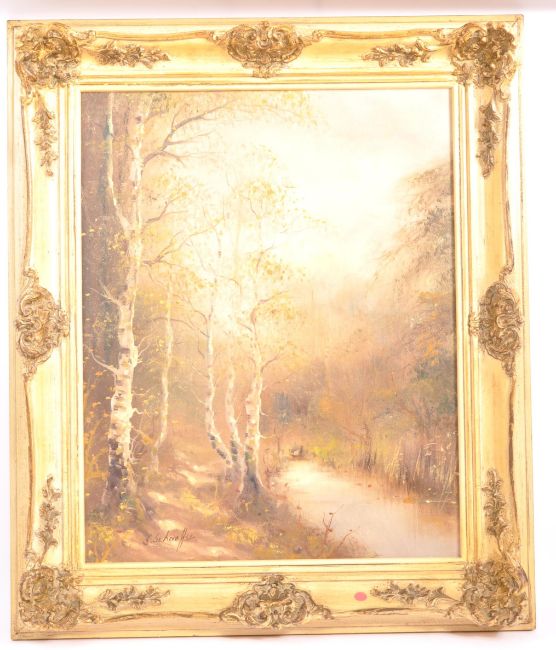 A signed 20th century oil on canvas painting depicting a woodland scene. Signed S. Schaeffer. Framed. Measures approx. 64cm x 54cm.