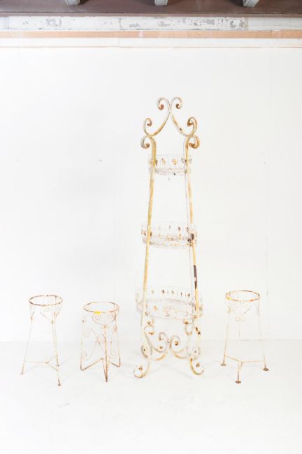 An assortment of vintage 20th century circa. 1950's manner white painted metal garden furniture to include a large jardinière of tapering form on scrolled base with a pair of smaller plant stands. Measures approx. 186cm x 68cm x 63cm.