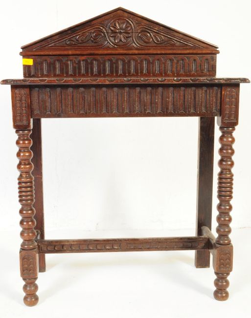 A Victorian 19th century carved oak Gothic console hall table. Raised on bobbin legs with carved frieze and flared tabletop with arched stage gallery back. Measures approx. 101cm x 77cm x 38cm.