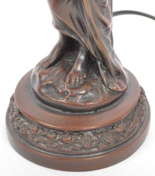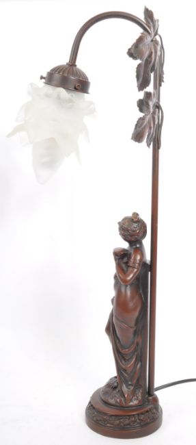 A 20th century Art Nouveau manner bronzed effect table lamp in the form of a maiden in classical dress on plinth base with pressed glass tulip shade.
