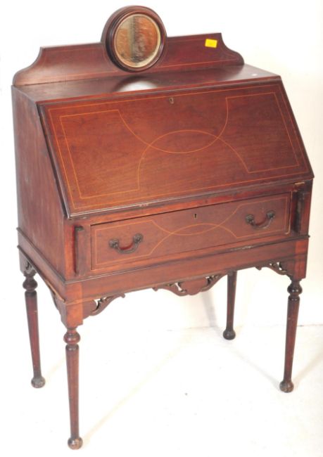 An early 20th century Edwardian inlaid mahogany ladies writing bureau. The bureau having gallery back fitted with circular mirror to centre, with inlaid fall front door, raised over pad feet. Measures approx. 116cm x 75cm x 42cm.