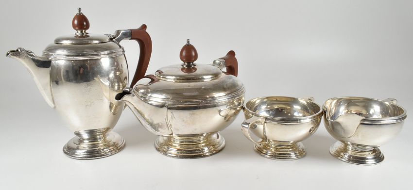 A Mappin and Webb hallmarked silver four piece tea service consisting of a tea and coffee pot, sugar bowl and creamer. The pots having hardwood handles and finials. The tea service hallmarked for Sheffield with the tea and coffee pot having date letter O for 1956, the sugar bowl date letter N for 1955 and the creamer having date letter M for 1954. Makers mark M&W for Mappin and Webb. Combined weight approx 1800g. Measures approx; Coffee pot 20cm x 20cm, Tea Pot 26cm x 15cm, Sugar bowl 16cm x 6cm, creamer 15cm x 7cm.