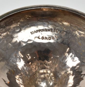 A hallmarked silver Arts and Crafts bon bon dish. The dish on a circular domed base with three arched arms supporting a round bowl. The dish having a planished finish. Hallmarked for London, date letter M for 1907. Makers mark MN&WB for Mappin & Webb. RD 429216. Weight approx 130g. Measures approx 8cm x 10cm.