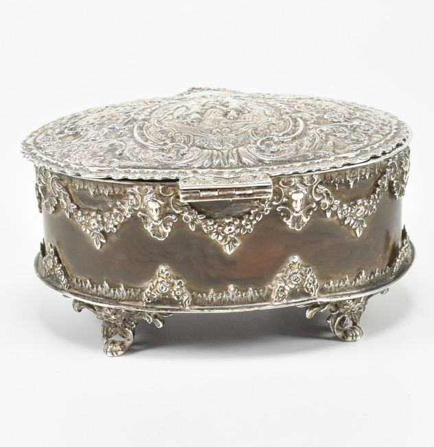 A Victorian hallmarked silver and tortoiseshell trinket jewellery box. The box having a repoussé decorated lid depicting two figures with blank cartouche and mounted swags and wreaths, to tortoiseshell body, raised upon hoof feet. Marked for Leuchars London. Partial hallmark GS Lion Passant S to lid. Weight approx 262g. Measures approx 13cm x 10cm. Tortoise shell base in situ but loose.