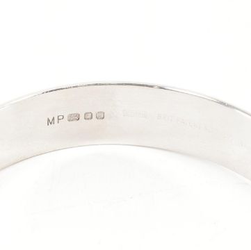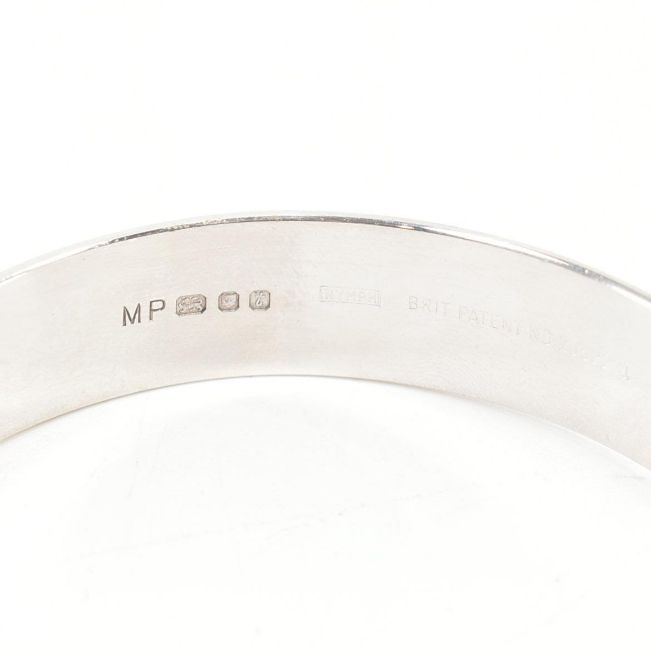 Three hallmarked silver bangle bracelets. All bangles of oval form with textured faceting throughout to clip clasps & safety chains. All hallmarked for London 1974, sponsors marks for MP - Maylin Products Ltd. Also marked NYMPH BRIT. PATENT No. 1052231. Total weight approx 79.0g. Largest measures approx 6x5cm.