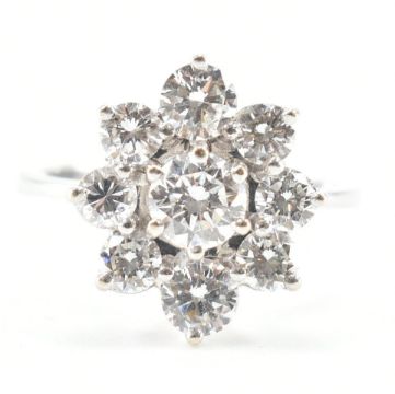 An 18ct white gold and diamond cluster ring. The ring set with 9 round brilliant cut diamonds to plain band. French assay mark for 18ct gold to outside of shank. Estimated diamond 1.5ct. Weight 3.72. Size K.