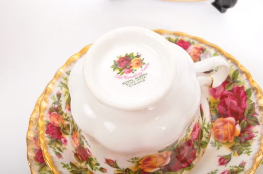 Royal Albert - Old Country Roses - English fine bone china tea service set. Comprising of; 2 x cups & saucers, plate, milk jug and sugar bowl. Having floral hand painted and gilt detail. Makers mark to underside. Along with Royal Grafton - English fine bone china tea service set. Comprising of; 5 x cups, 6 x saucers, 6 x plates and serving plate. Having floral and gilt detail. Makers mark to underside.