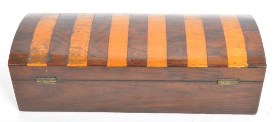 An early 20th century wooden marquetry pen box of domed form with inset inkwell slot. Accompanied by key and a boxed parker "17" pen. Measures 24cm length.