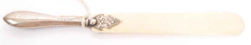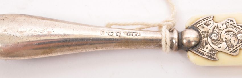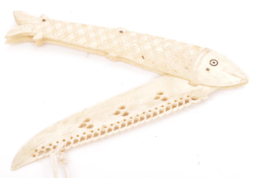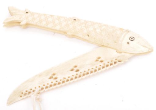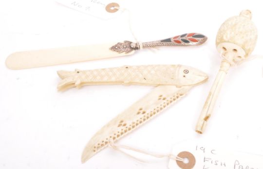 A collection of three 19th century carved horn items. To include an infant's baby rattle / whistle (12.5cm), a letter opener in the form of a fish (13cm) and a book page turner with hallmarked silver handle (18cm).