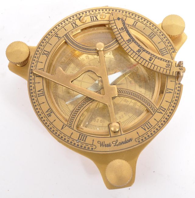 A 20th century reproduction ships brass compass / sundial marked up for 'West London'. Accompanied by an unmarked brass sextant. Measures approx 12cm diameter.
