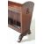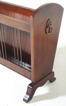 A vintage 20th century mahogany wood magazine / newspaper holder rack. With arched ends, drop in centre partition with wire work to sides. Mounted lion heads to ends all raised on trestle legs. Measures approx 42 x 50 x 24cm.