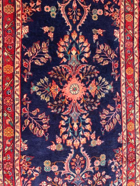A 20th century North West Persian Sarouk runner floor carpet rug. The rug having a deep blue ground with central run of cicek and hayat agaci surrounded by a border of foliates. Measures 317cm x 91cm.