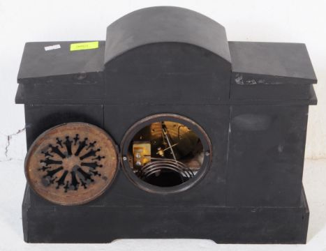 A 19th century Victorian slate and marble 8 day mantel clock. Having a central arched top with sloping sides with mounted front with pillar columns either side of enamel clock face with gilt rim and ebonised chapter ring all raised on a plinth base. Measures approx 33 x 40 x 13cm