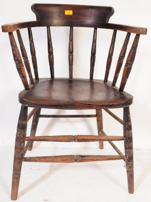 A 19th century Victorian era beech and elm smokers bow captains armchair. The chair having bowed top rail with a series of nine  ring turned spindles to back over saddle seat upon tapering ring turned supports united by stretchers. Measures approx. 86cm x 37cm x 48cm.