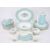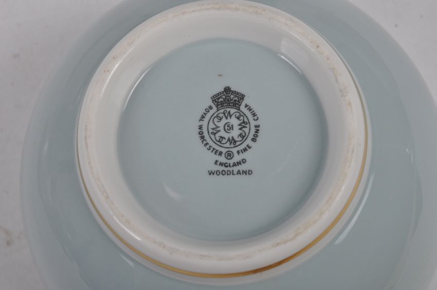 Royal Worcester - 'Woodland' pattern - A mid 20th century part dinner / tea service, with duck egg blue rim and white central ground with blue and violet floral & foliate design. Comprising teapot, large serving platter, three serving tureens / bowls, six soup bowls, six starter plates, one circular serving plate and six dinner plates, a gravy boat and stand, a cream jug, two small bowls, three small dishes and two toothpick holders. Teapot to measure approx. 23.5cm tall, platter approx. 33cm x 28cm.